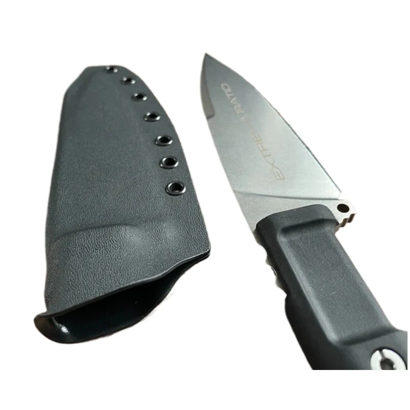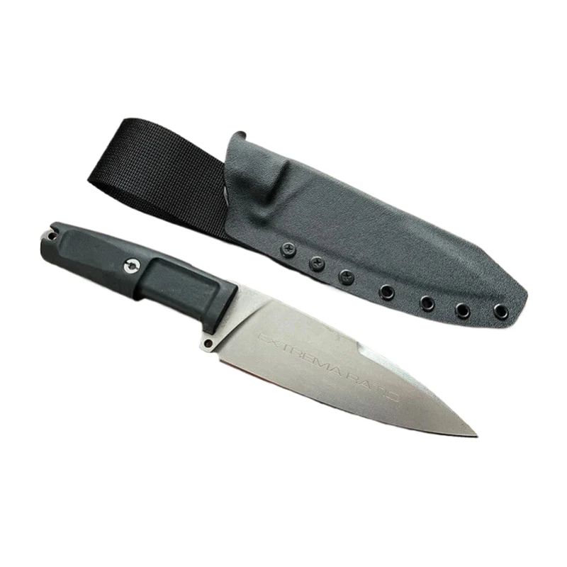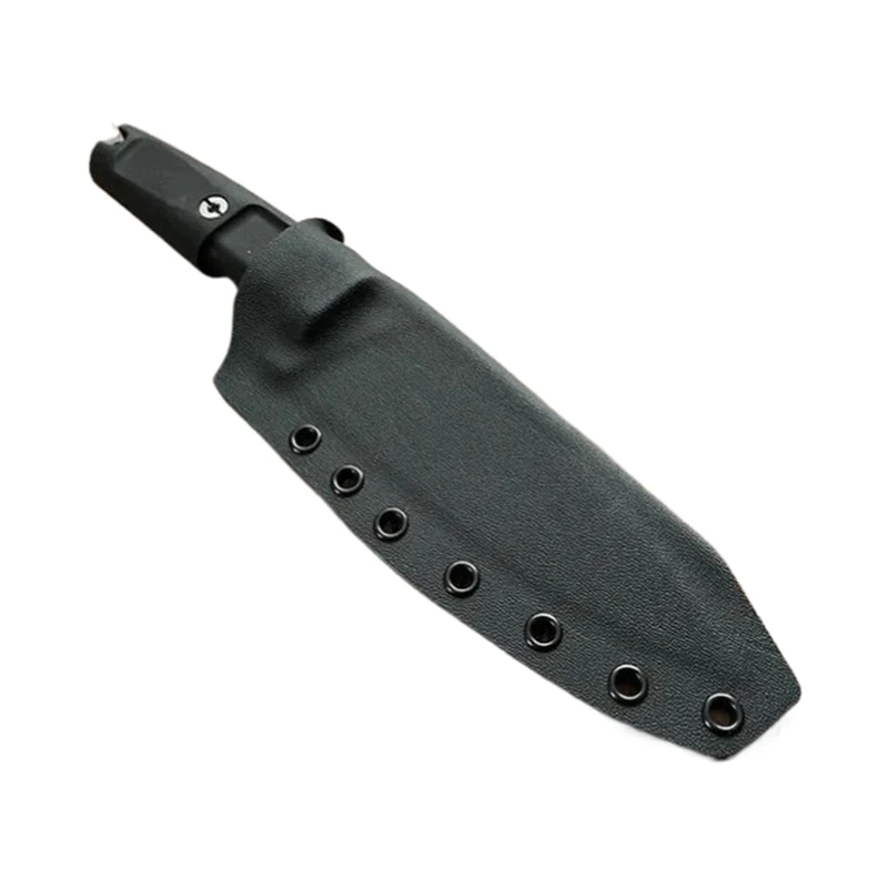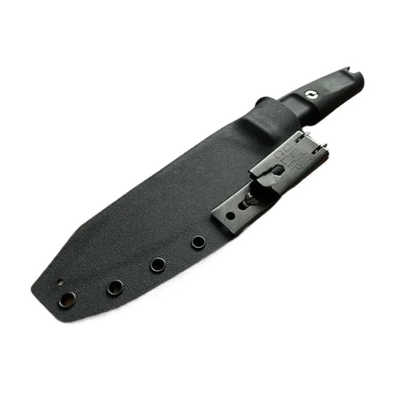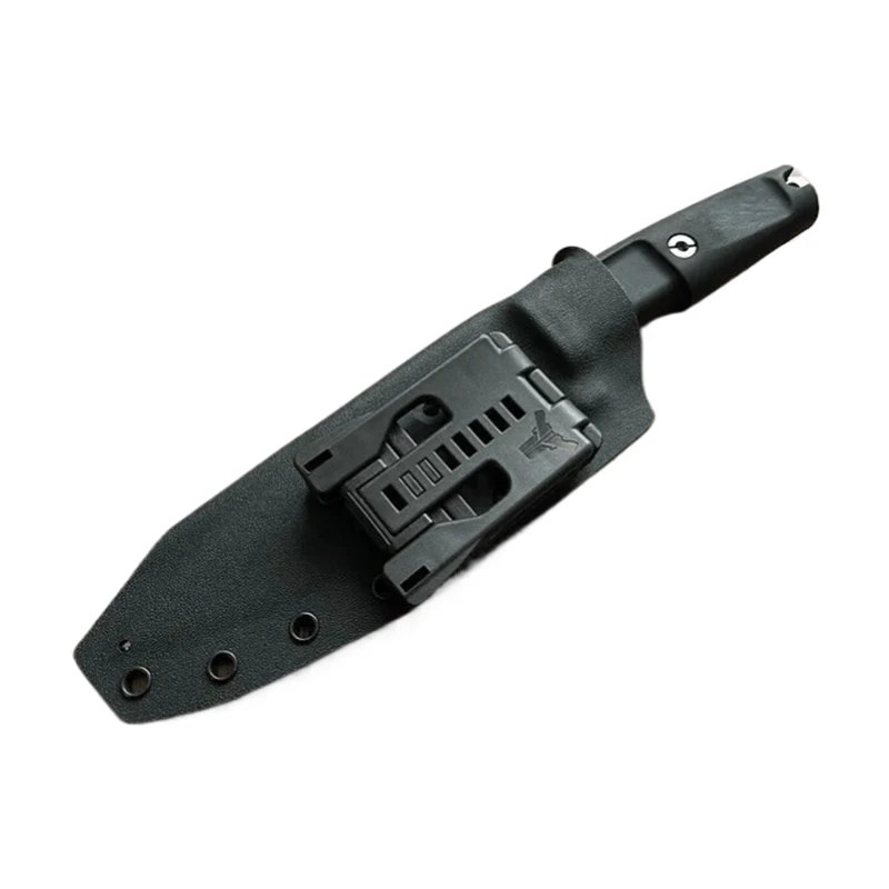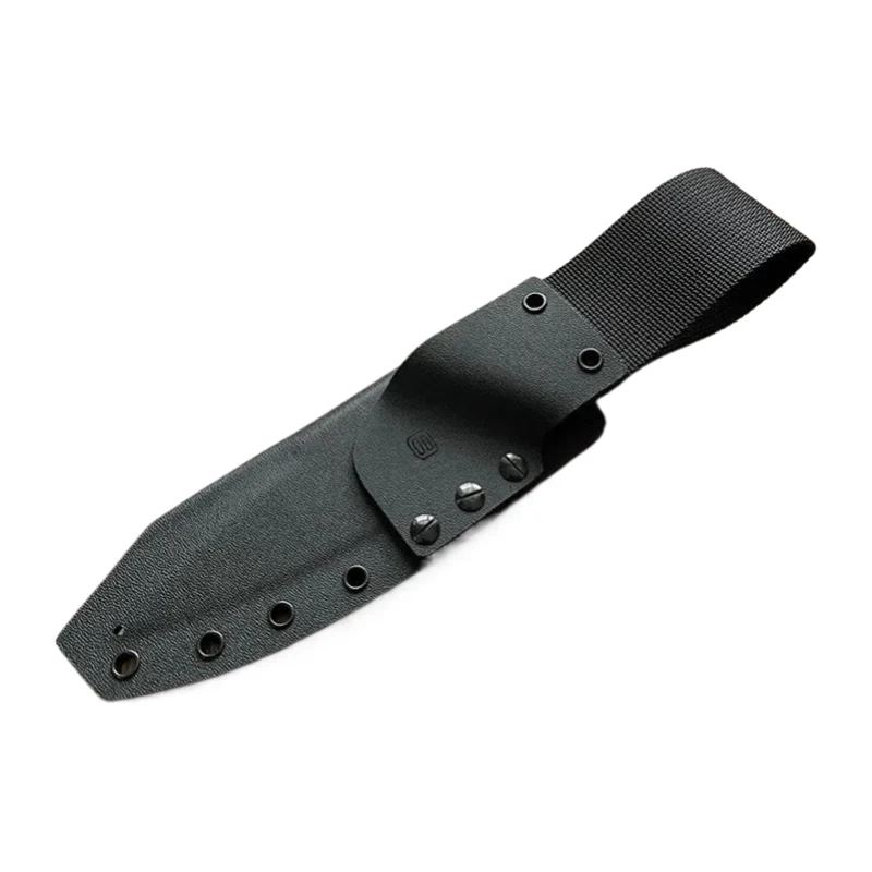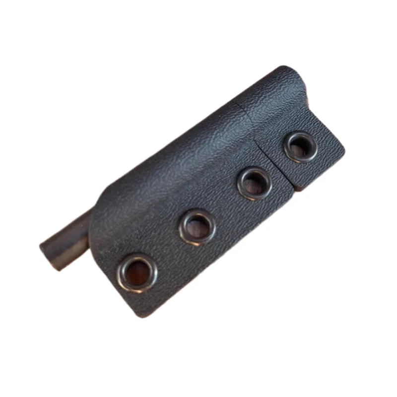 Camping Fixed Blade Labana eta Sheath Shrapnel One gerrikoari modu tradizionalean eransteko, horizontalean edo bertikalean, nire bezeroek Multi-Lok aukeratzen dute normalean. Labana pixka bat beherago eraman nahi baduzu, Kydex euskarria duen nylonezko uhala gomendatzen dizut. Velcro aproposa da labana gerrikoan zehar eramateko. Belkroa motxilaren uhalean labana lotzeko soluzio praktikoa ere bada. Kydex zorroaz gain, suzko altzairuzko euskarria erantsi dezaket, aukeran suzko altzairuarekin (80 mm-ko luzera).